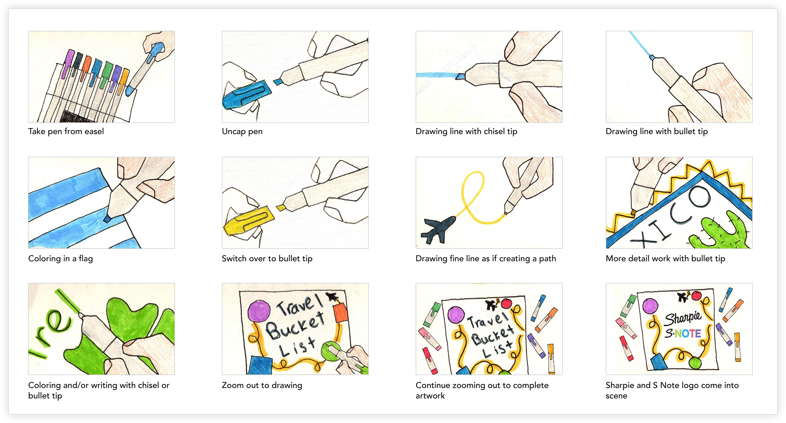 The Sharpie SNote video tells the story of building a travel bucket list through its mild colors, showcasing the versatile chisel tip and creative potential in every stroke.